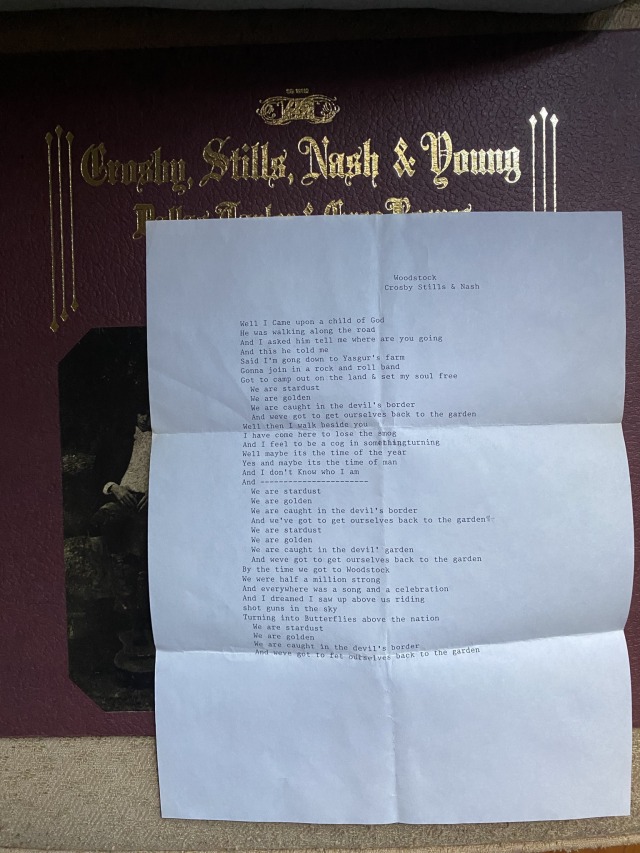 Inside the dust sleeve was a folded up piece of paper, on which the lyrics to “Woodstock” were typewritten. A cool little keepsake from the past.